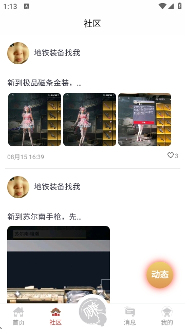 然后社区中则是为大家提供了一个便捷的在线交流的窗口,点击右下角的【动态】按钮可以发布自己的游戏日常。