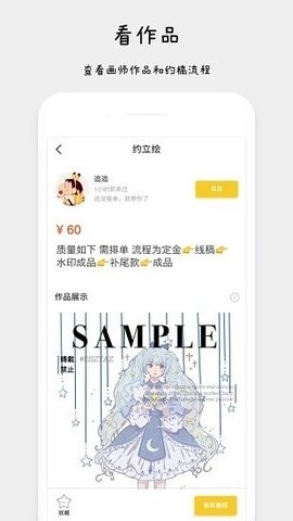 能够关注自己感兴趣的画师,可以在橱窗查看画师约稿的具体价格。