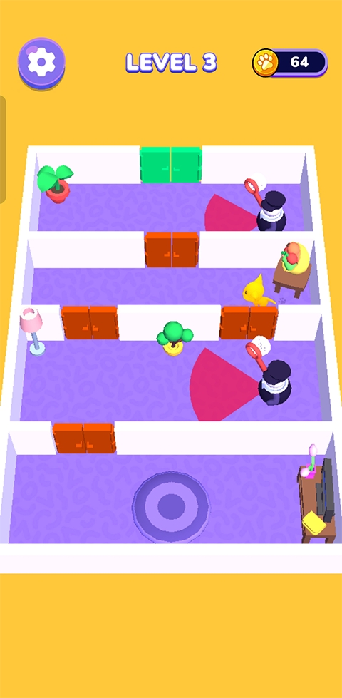 潜行躲避,智取生机:玩家需精准操控小猫潜行移动,时刻留意保安视线范围,巧妙借助环境中的障碍物隐藏身形,避免被捕获,以隐蔽的方式在迷宫中探索前行,寻找逃生突破口。
