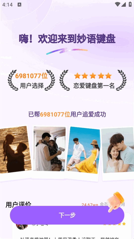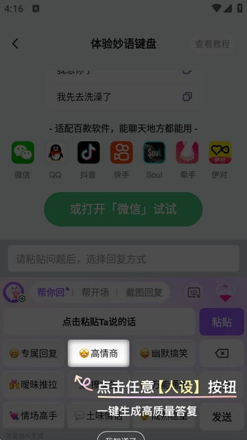 妙语键盘是一款功能丰富的趣味聊天键盘软件,内置海量高情商回复话术、开场技巧及个性化人设模板,能持续为用户供给聊天话题,可以让更多人轻松学习各种各样的恋爱话术以及恋爱技巧,可以精准高效在线轻松聊天。