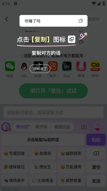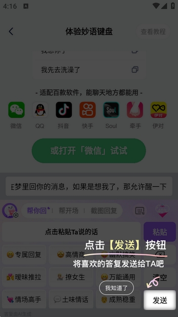3、用户使用聊天话术可以回复异性的所有信息,能够全程帮助用户与异性聊天。