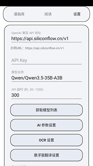 注:为了保证漫画可以按正确顺序阅读,请务必确保:图片的文件名顺序与漫画的阅读顺序一致,(例如 1.jpg, 2.jpg)图片添加完成后,就可以前往设置页面填写 API信息啦