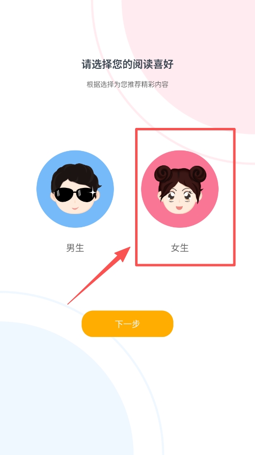 2、接着选择阅读喜好男生或女生,系统会根据你的选择推荐个性化小说内容。