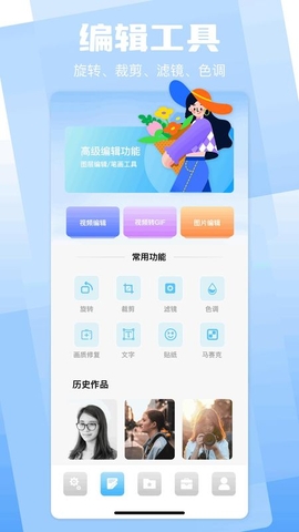提供裁剪、旋转、调色、滤镜、添加文字/水印等编辑功能。
