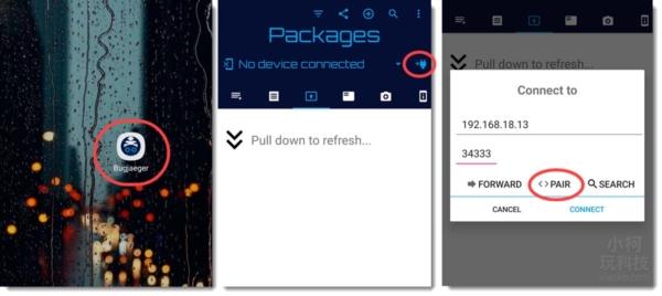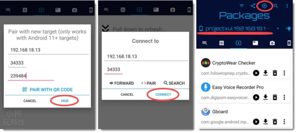 请依手表上出现的配对码输入;再按 PAIR →此时再对照一下手表及手机上的 Port号是否相同,再按 Connect 。只要看到中间的蓝子字串上出现 192.168开头的数字即代表已连线成功。若要传送 APK到手表上,请按屏幕顶端的+图案