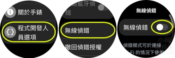 双击双击返回键后,就可以看到关于手表下多了一个程序开发人员选项的选项点下去,选择无线调试,接下来再开启无线调试(此时手表会自动打开 Wi-Fi功能)
