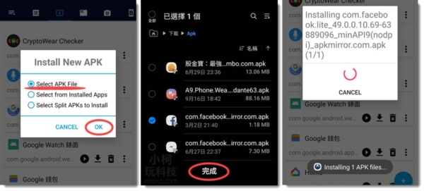 选择 Select APK file (也就是选择 APK文件)按OK →接下来请在手机下载的文件夹中找到要上传到手表的 APK文件 →手机就会开始传送 APK文件。