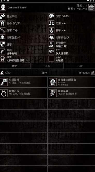 装备:橡木法杖(法术加成)+布甲(轻量化)+智慧项链(蓝量+理智回复),优先法术强度装备。