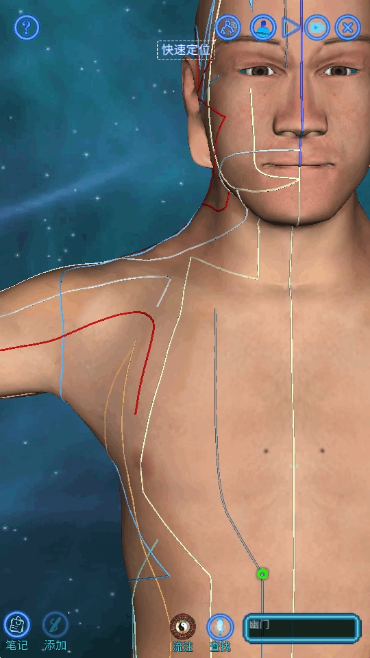 2、三维展示人体经络穴位,可以语音和文本查找穴位,拥有子午流注的顺序流注等演示。