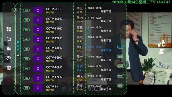 2、手机端用户点击左侧屏幕,电视端用户使用遥控器按菜单选项可以唤起电视频道列表。